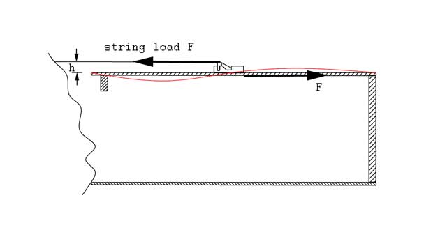 Fig 1. below illustrates the key problem. Forces of strings in tension and force that holds the bridge attached to the guitar soundboard top do not act in the same plane. These forces produce the static bending moment F*h that continuously acts to bend the guitar soundboard.