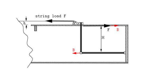 In my preliminary attempt I installed another tube, parallel to strings, under compression, to produce force B on the tip of the vertical tube approximately equal to B=F*h/H (see Fig 2 for notation). In my final design I used a nylon string in tension along the arrow of the force B, connecting the bottom tip of the vertical tube to the bottom base of the guitar neck. This "additional internal string" provides minimal possible constraints to vibrations of the top.
